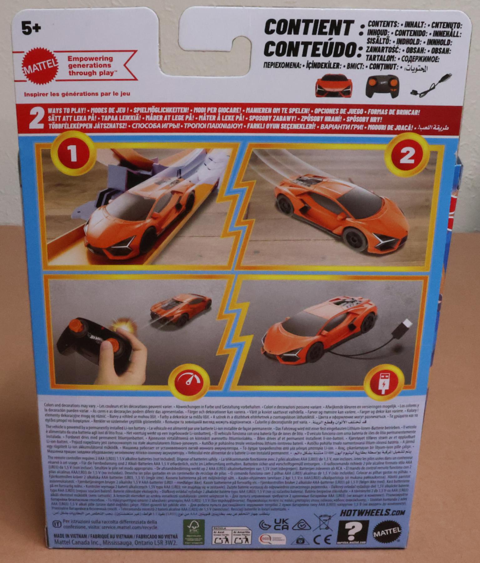 The back of the box shows that the car can be run on Hot Wheels' track system or on a flat floor. The controller allows for forward and reverse (left joystick) and left and right (right joystick). There is a button on the front-right of the controller that pushes the car into "turbo" mode. The controller requires two AAA batteries (the controller automatically turns itself off when not in use for a little while). The company claims a control range of up to 80 ft (25m).