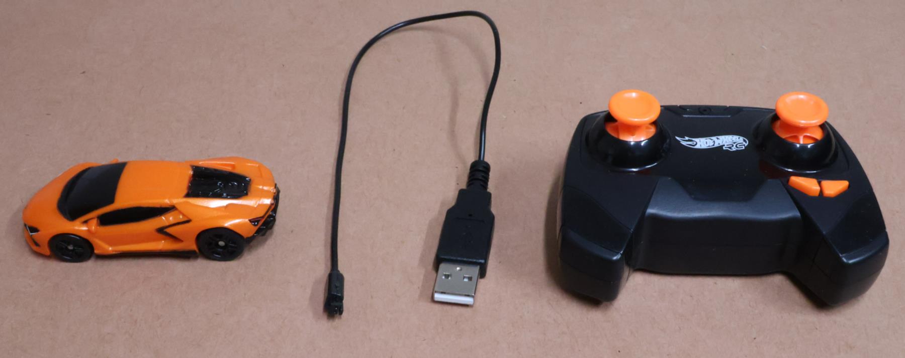 The box includes a short cable that can be used to charge the car's internal battery. It can be plugged into any USB plug. I plugged it into my PC's USB port and it charged the car in a few minutes. The car's bottom has the mini charging slot, the on/off switch, and a red LED indicating that it is charging, and a green LED indicating that charging has completed. The controller has two orange arrow buttons that do nothing, so that must be for a feature of another car.