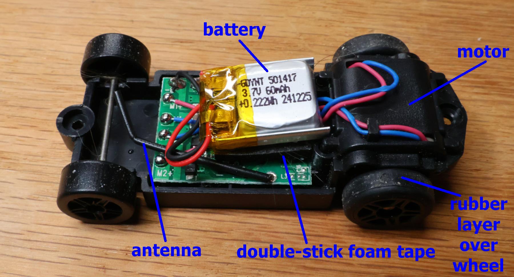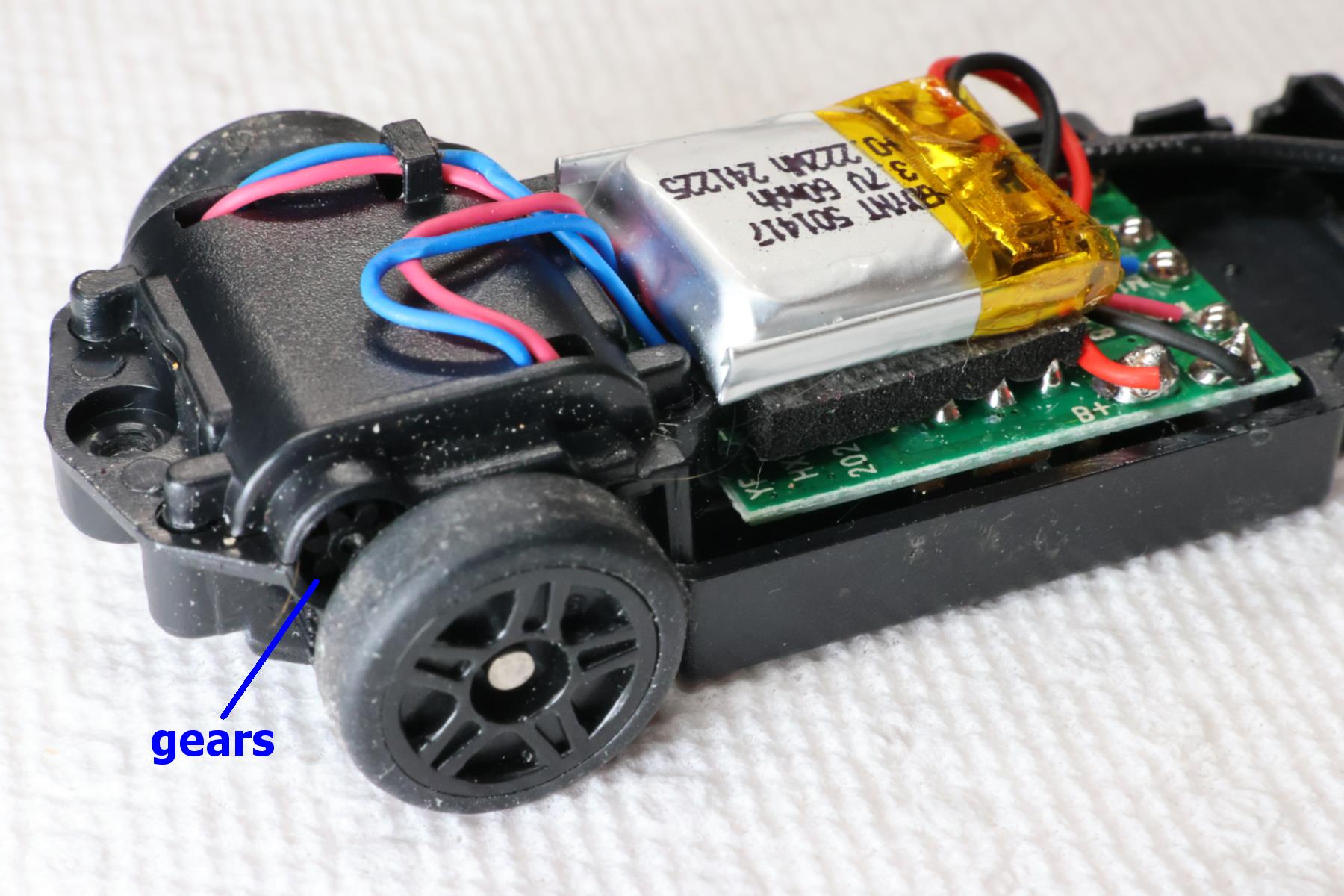The first thing I noticed was the 60mAh lithium-ion battery that powers the unit. The circuit board holds the receiver and the logic. A black wire sticks out from it, which is the (presumably Bluetooth) antenna. The circuit board does not budge. The battery is held to the board using some thick foam tape. The motor makes up the entire rear end of the car. Please excuse the cat hair in the model, because I ran this for a while on the floor with the cats playing with it. I'll have to routinely open it up and clean it out.