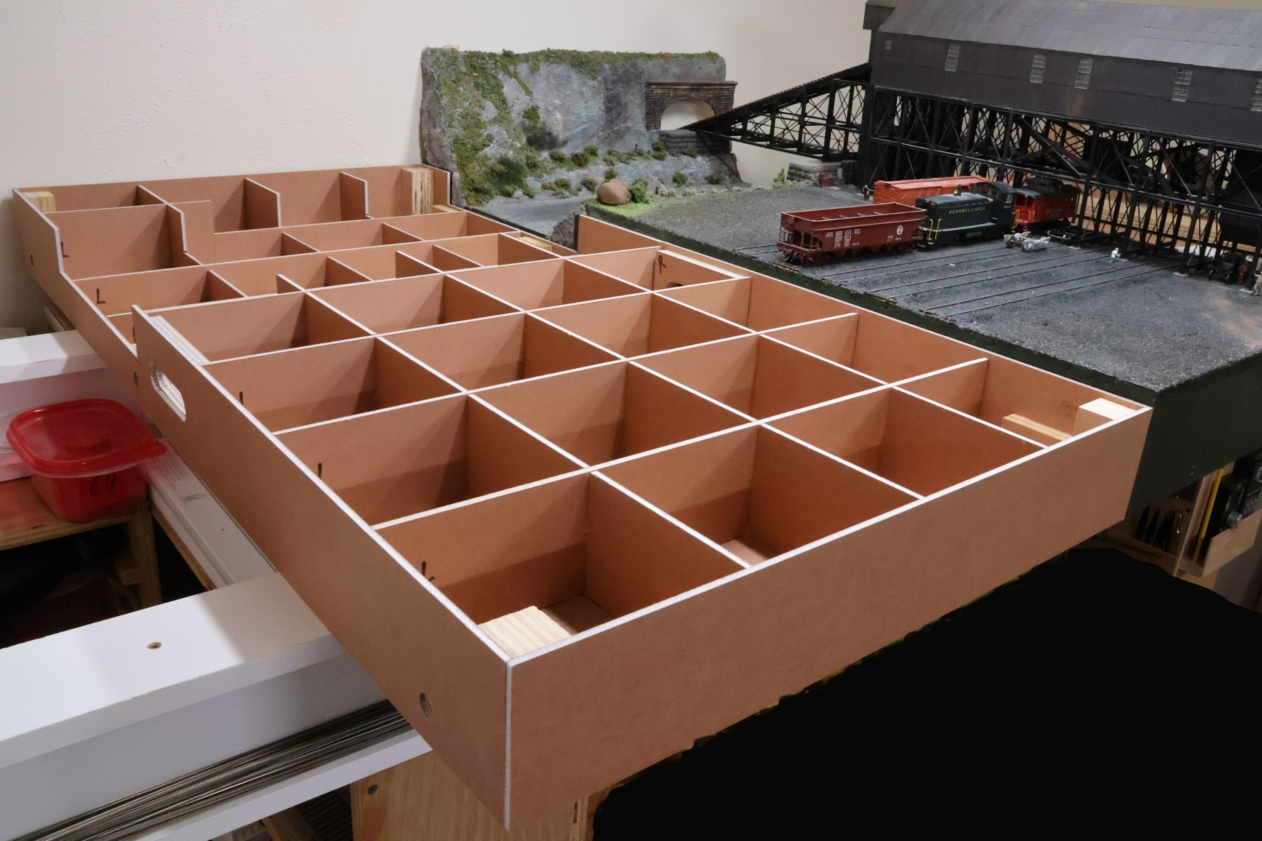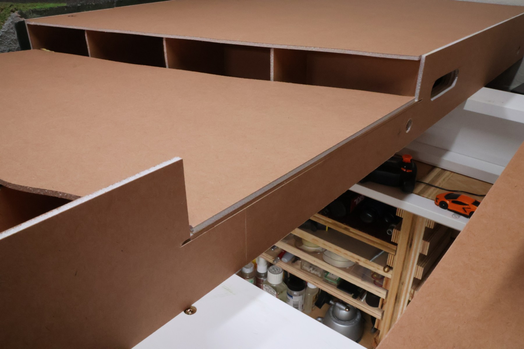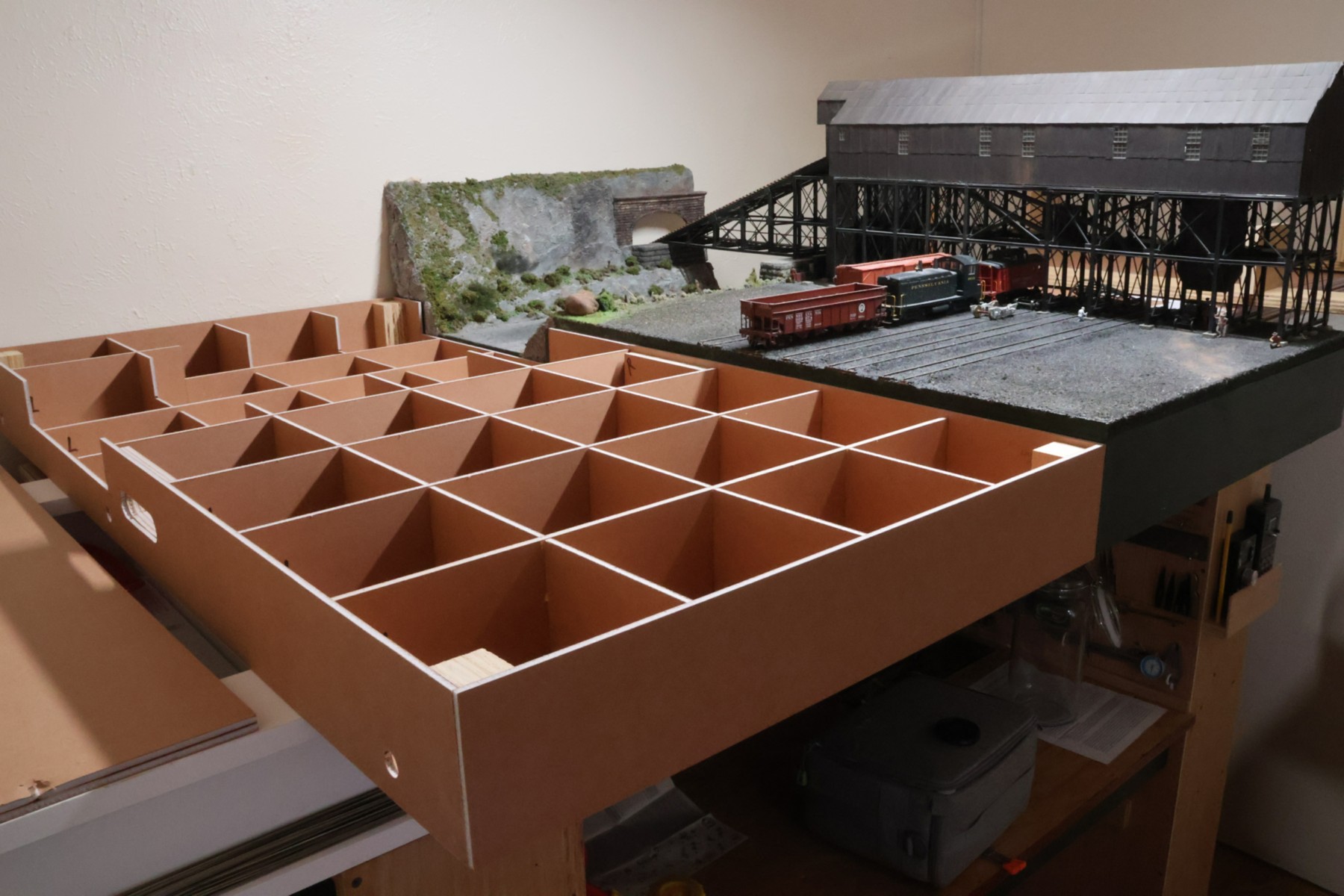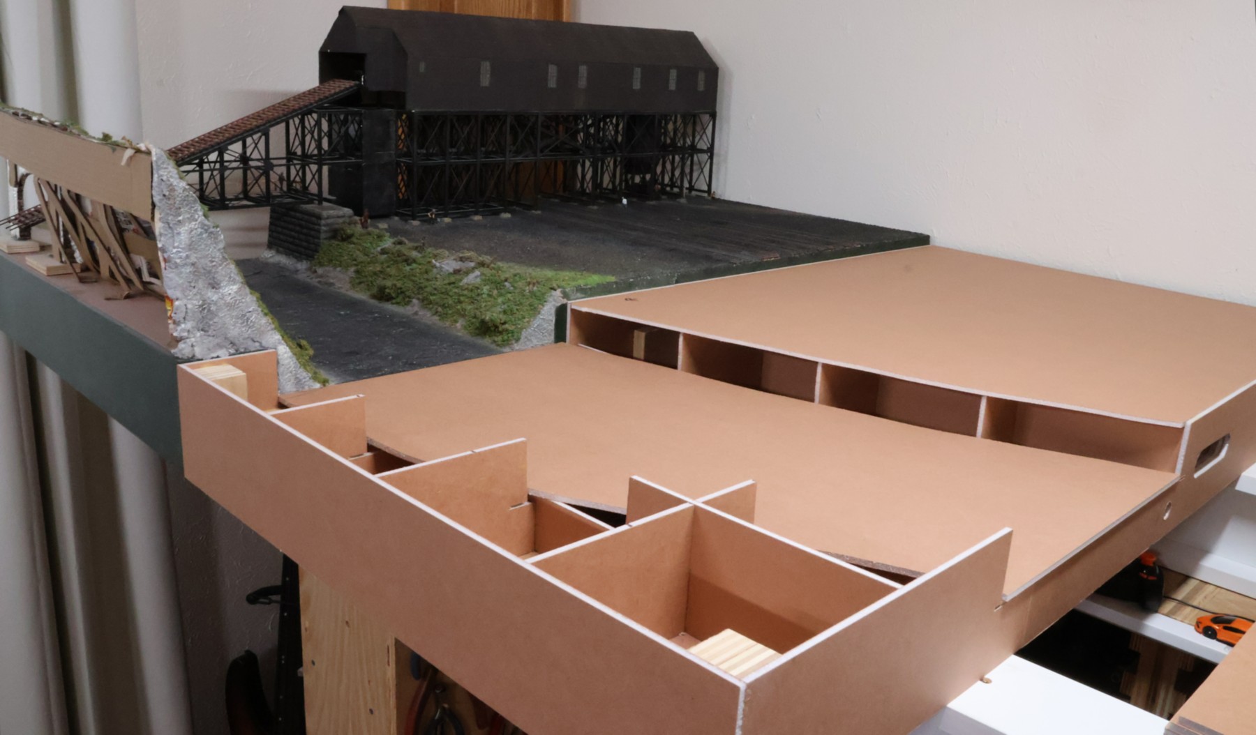 Installing and attaching the "landmass" at the front of the layout was trivial: apply glue to the interior lattice-work and put lots of weights on top of the panel.