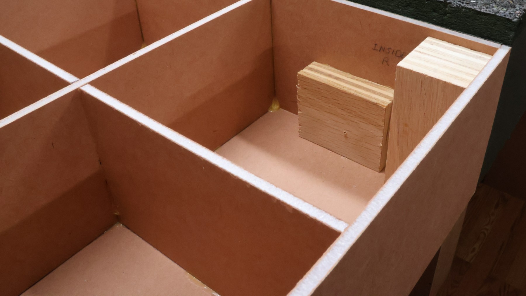 The next step is to be able to attach this second module to the first one. I had pre-drilled the holes for the alignment dowels and the holes for the magnets. Both of those need solid backing to be able to last. So, I cut a number of 2" x 2-1/2" blocks of 3/4" plywood and glued them to the interior of the side panels behind each of the pre-drilled holes.