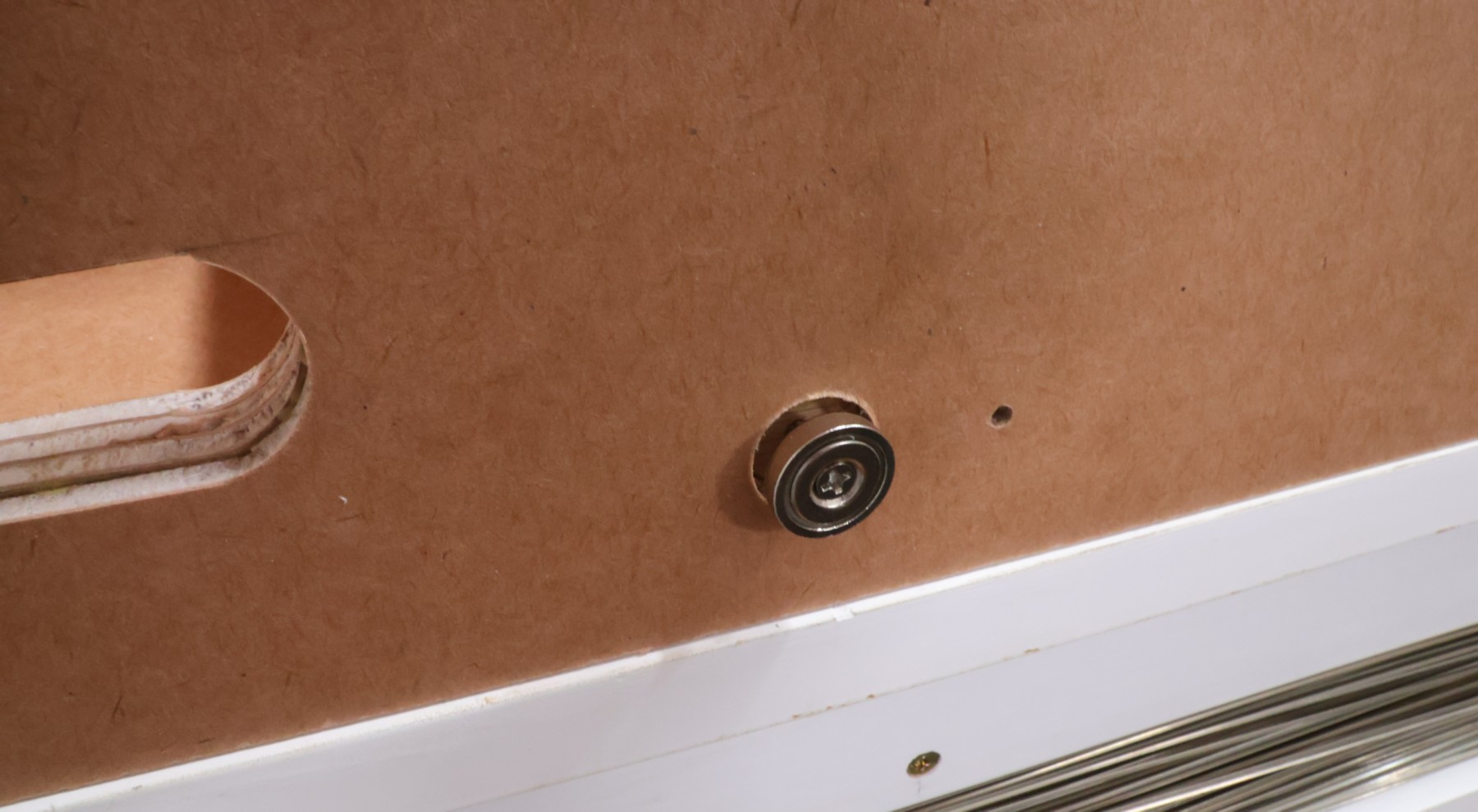 When it was in position, it was perfectly flush with the outside edge of the Gatorfoam board side panel. It was pure dumb luck that the magnet's thickness is the same as the thickness of the Gatorfoam board. The hole next to the magnet is for the alignment dowel/pin.