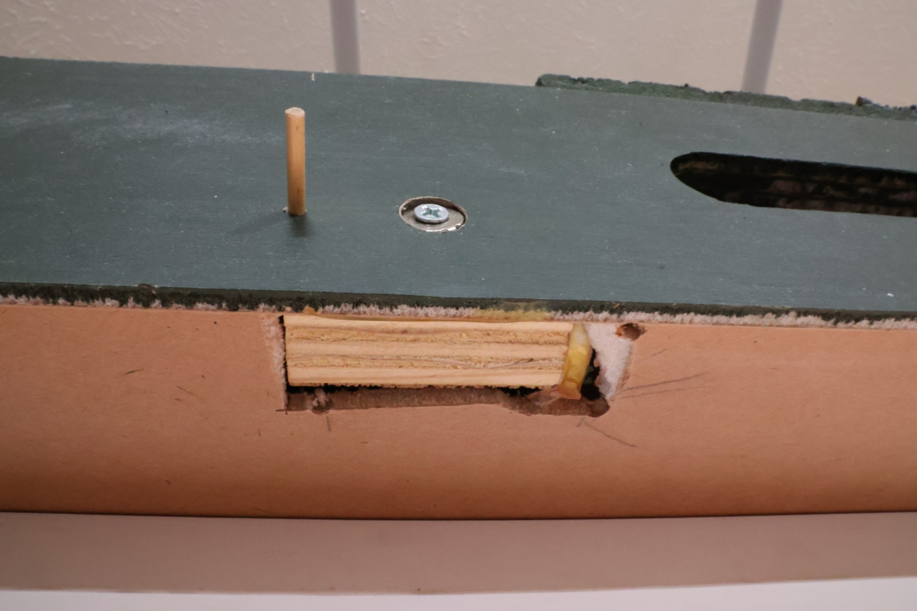 It took many ideas and some false-starts, but I eventually settled on this system for retrofitting the first module to be able to be connected with the second module via magnets. What this photo shows is the underside of the first module, where I marked off and cut out a rectangular hole slightly larger than the block of plywood. I then glued the block to the inside of the module's side wall, using a thin file to press it against the side wall long enough for the glue to hold. When it was all cured, I used a Forstner bit to drill a hole through the Gatorfoam side wall until I hit the plywood block. I could then pre-drill a hole for the screw. The screw has three metal washers (to offset the thickness of the Gatorfoam) so that when it was installed, it was flush with the side of the Gatorfoam wall. The dowel is the align pin used for the modules.