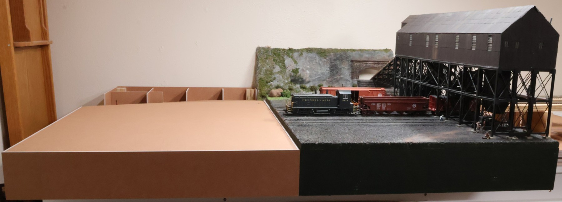 With all three of those retrofits completed, I was now, finally and officially, able to connect the second module up to the first one. I was worried that the magnets (three of them) were too strong. It turns out that while I cannot separate the modules easily, it also doesn't take too much effort to get them to separate. This is probably ideal; I don't want them to come apart when I accidentally hit the layout, but I do want them to come apart when I need access or clean the modules. As stated above, there is a gap, but so long as the gap is the same each time the modules go together, then the scenery at the top as well as the rails should always line up perfectly. By the way, I also cut the two panels that are the foundation for the landmass in the front and the creek bottom in the back (barely visible). In the first module I also made such a "land form" for the back area, but that turned out to be wasteful as it was eventually covered by the hill in the background. The hill will continue on this second module as well, of course.