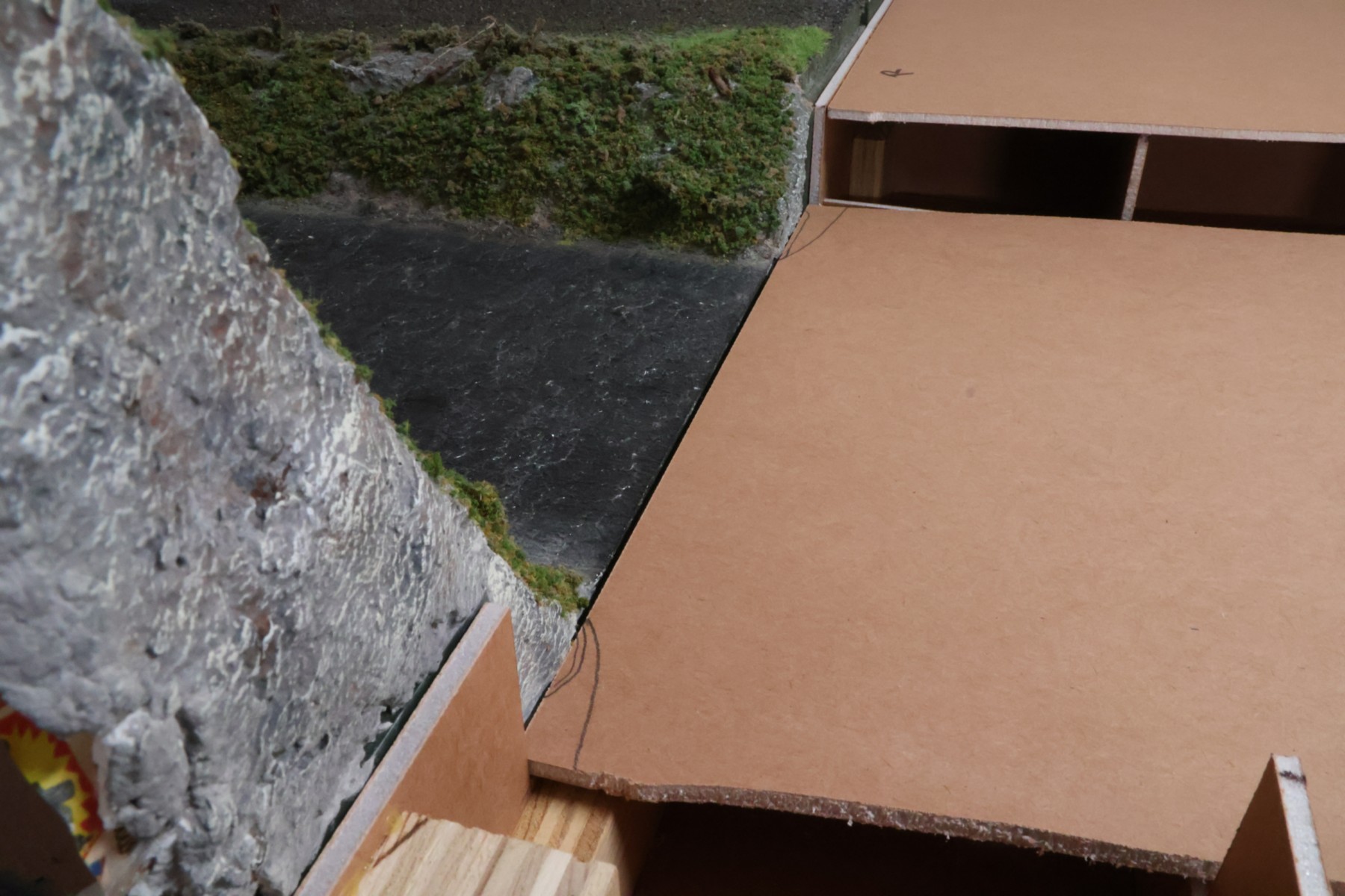 I knew this ahead of time, so I made this panel a touch longer than it needed to be, so that the extra length will nicely butt up against the first module. This view is from the bottom of the second module, looking up at the creek panel.