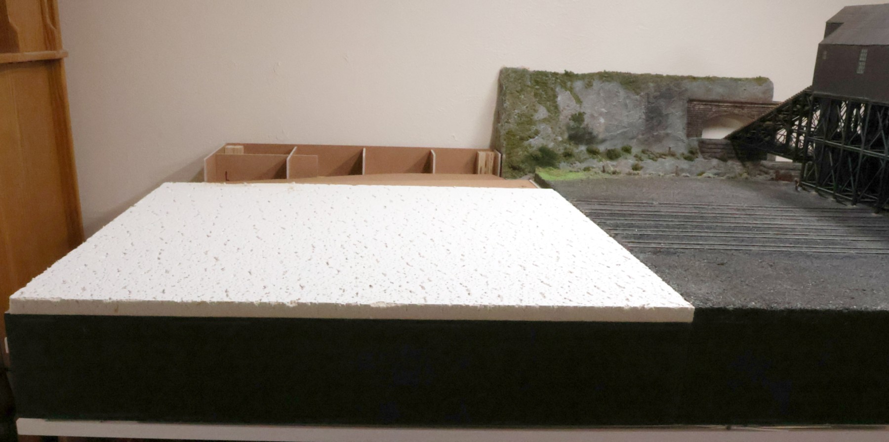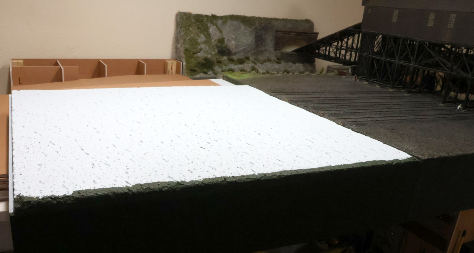 I tried a little bit of "grading" of the ceiling tile, but it was just too nasty to do, so I stopped. When I disconnected the module from the first one and then removed the alignment pins/dowels, the modules lined up, vertically, much better, to where the tracks should be a close match, vertically. So, apparently the drill bit must have wandered off a bit when I drilled the holes for the alignment pins. It seems that if I align the front edges of the two modules, things align just fine. I painted the ceiling tile as well with some left-over light-blue paint, just to seal it; that is all going to get covered with track, ballast, and greenery in the near future anyway.