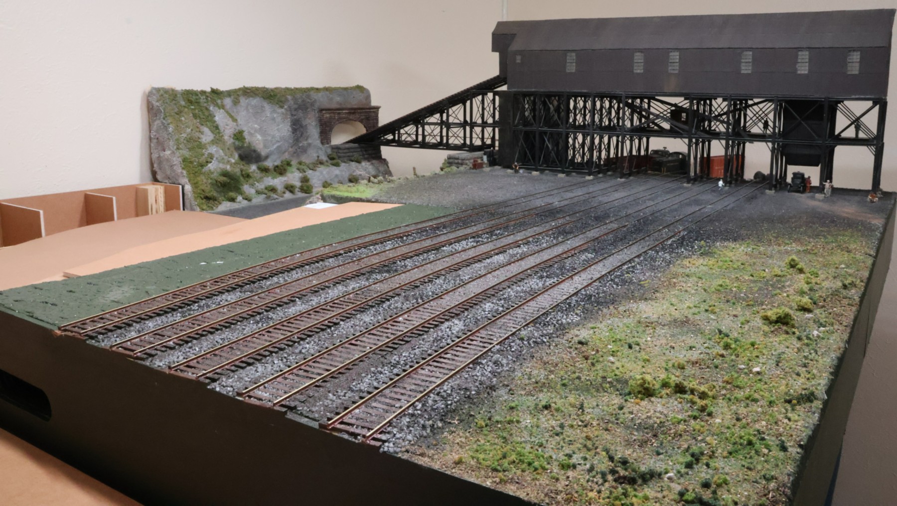 It is hard to believe that it was almost 4 years ago that I put the first five tracks down on the first module. My, how time flies! Micro Engineering took over production and sales of S-scale's flextrack product in 2025, and I bought the code 100 version when it was available for ordering. It arrived just as I was wrapping up the construction phase of this module, so it was perfect timing. The big issue, and I spent a few days thinking about this, is what the shape of the track should be. Prototype photos show a definite curve in the outfeed yard of the tipple, back toward the main Chartiers branch line. However, period track drawings (e.g. Sanborn maps) show a substantial amount of straight track before the five tracks curve and then merge. I decided to go by what the early 1900s photos show. When laying multiple side-by-side tracks on a curve, you always start with the inner curve, otherwise, if you start with the outside track, the inner curve winds up being too tight. I used metal weights to hold the track down once I had the curvature I wanted, as well as two small clamps to keep the rail in perfect alignment with the rail from the first module. The light-blue paint for the ceiling tile was actually a blessing, because it allowed me to trace out the area where I needed to apply the glue for the track. I used Liquid Nails glue for the first module, but I didn't have any on hand, so I just used yellow carpenter's glue for these flextracks. Worked just fine.