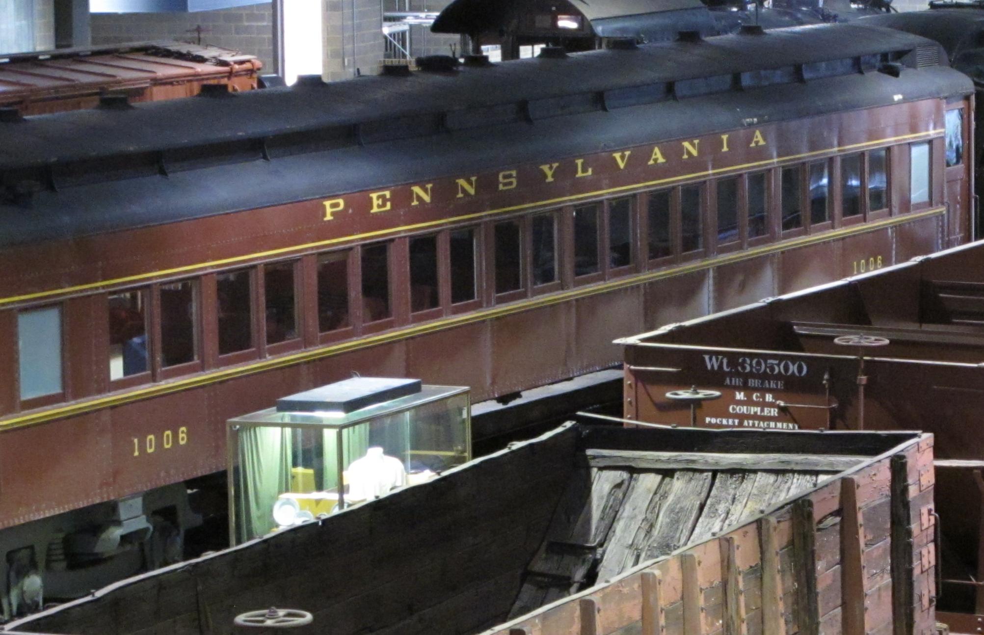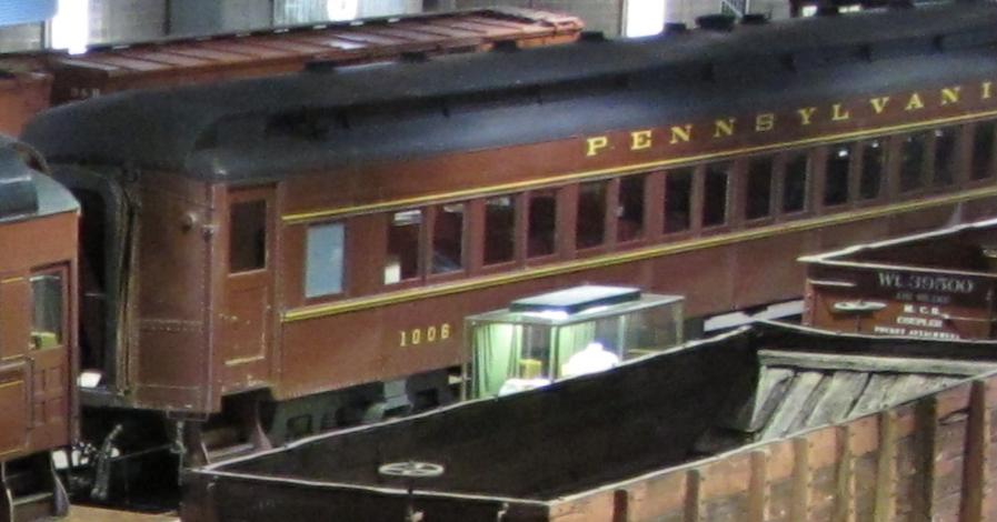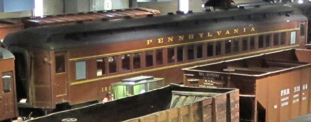 The P70 class passenger cars were the PRR's first heavyweight, all-steel coaches. They were built between 1907 and 1929, totaling more than 1,000. They were 80' long (measured from diaphragm to diaphragm), 9'10" wide, and stood 14' tall. The "70" in the class name indicates the length of the passenger compartment, proper. Their empty weight was 113,000 pounds. The cars had enclosed vestibules. Opposite corners of the car had a men's room and a women's room. Each benchseat had a window. There are ten pairs of windows, with one single, stand-alone window at each end on each side. Most seats faced from the A end to the B end; three benchseats were oppositely-faced. There were 22 benchseats on each side of the aisle, with each benchseat having enough space for two passengers, thus making up the maximum total of 88 passengers per car. Note that in 1926 they were modified to only hold 80 seats total. Later modified cars will not have the stand-alone window on the right-hand side of the car.