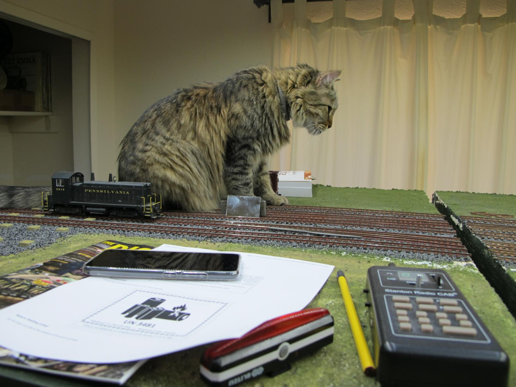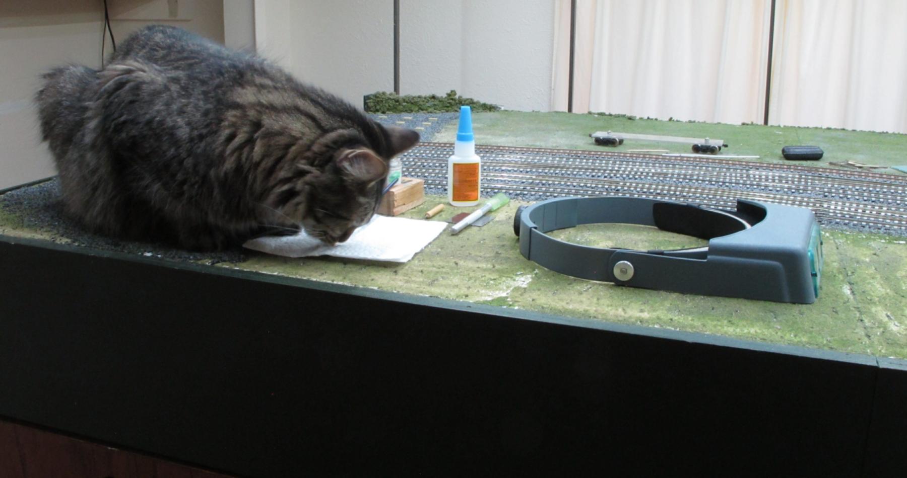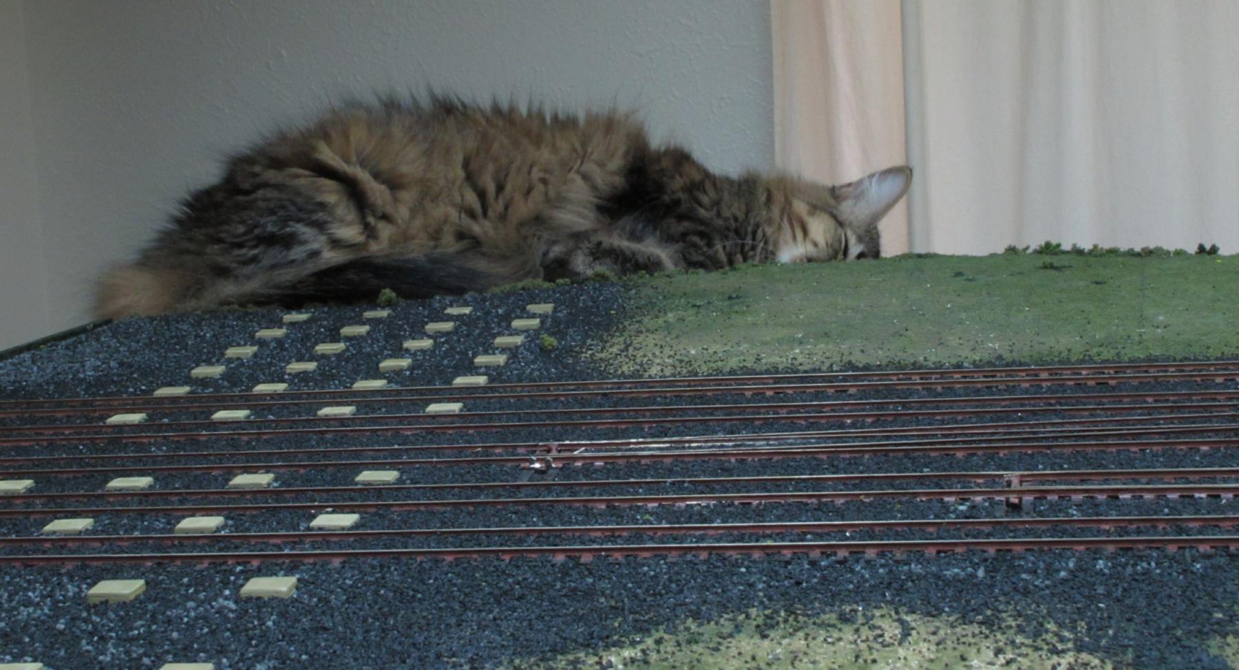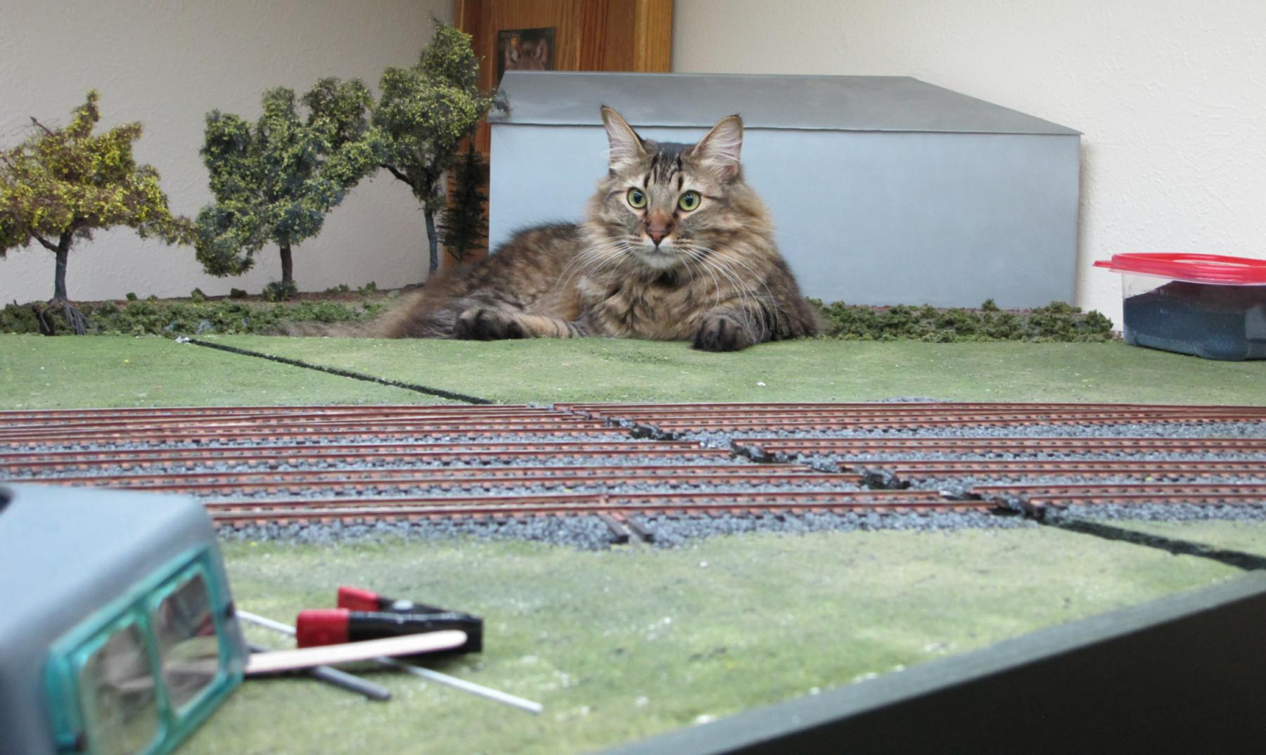 You're not supposed to have favorites among your "kids", but our dearly-departed Tobey was my all-time favorite. Here he is "sniffing glue", as teenagers do these days, on top of my previous layout.