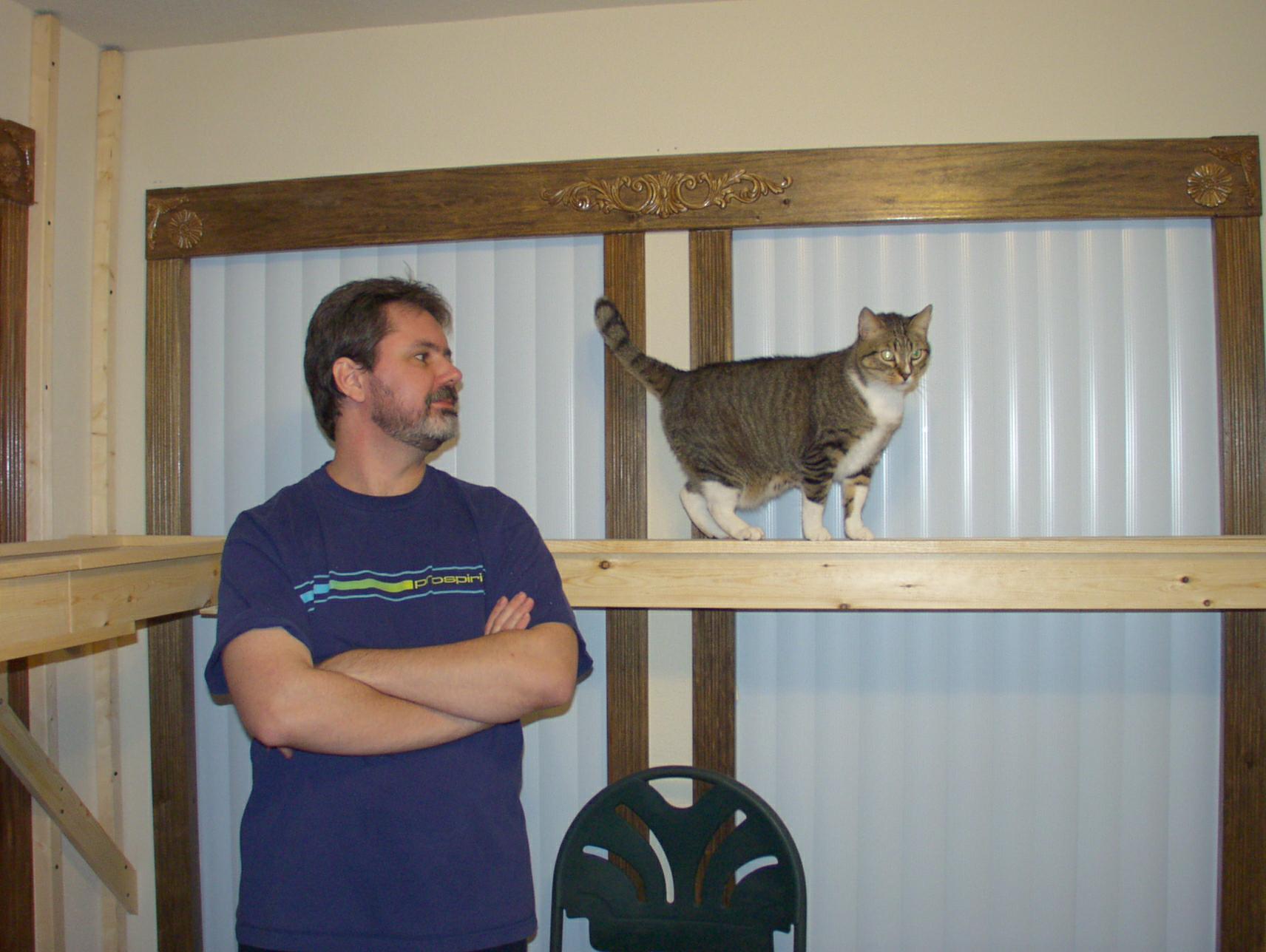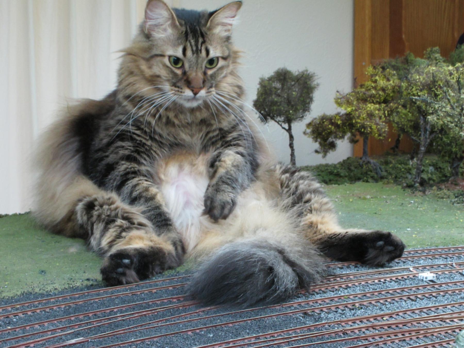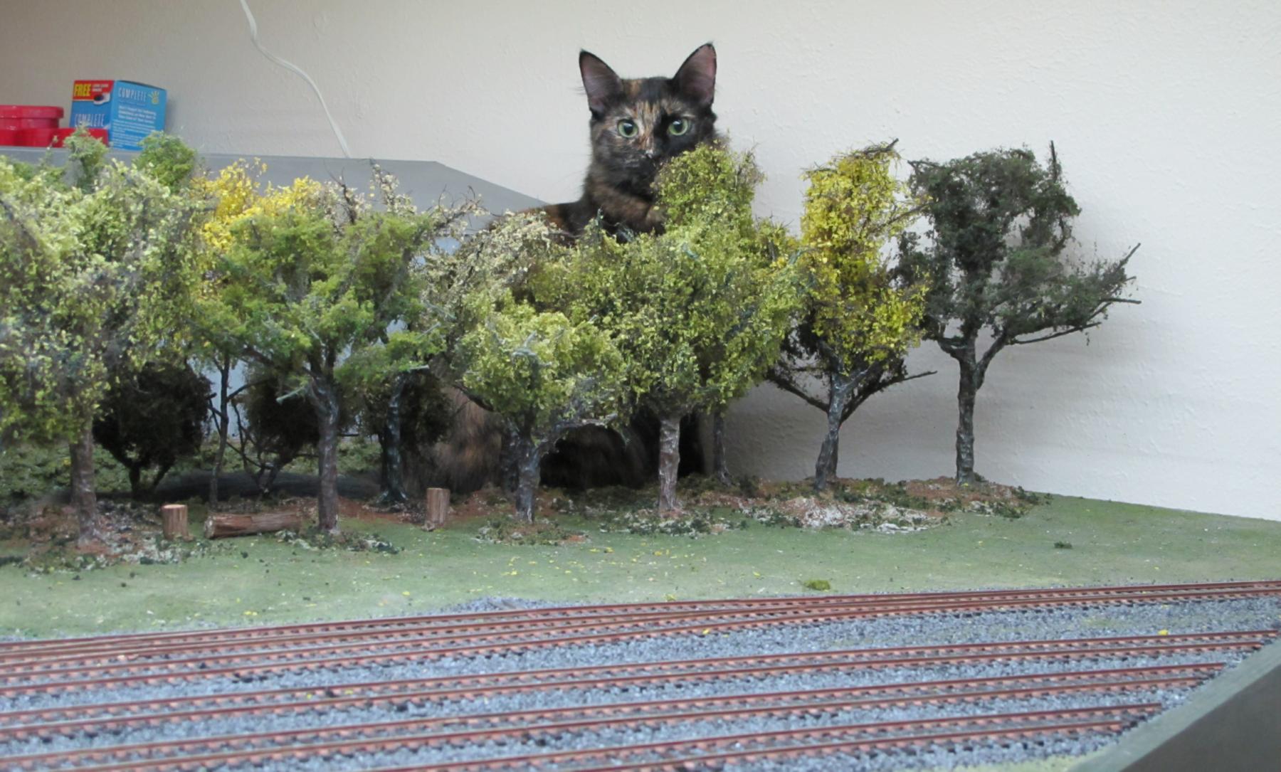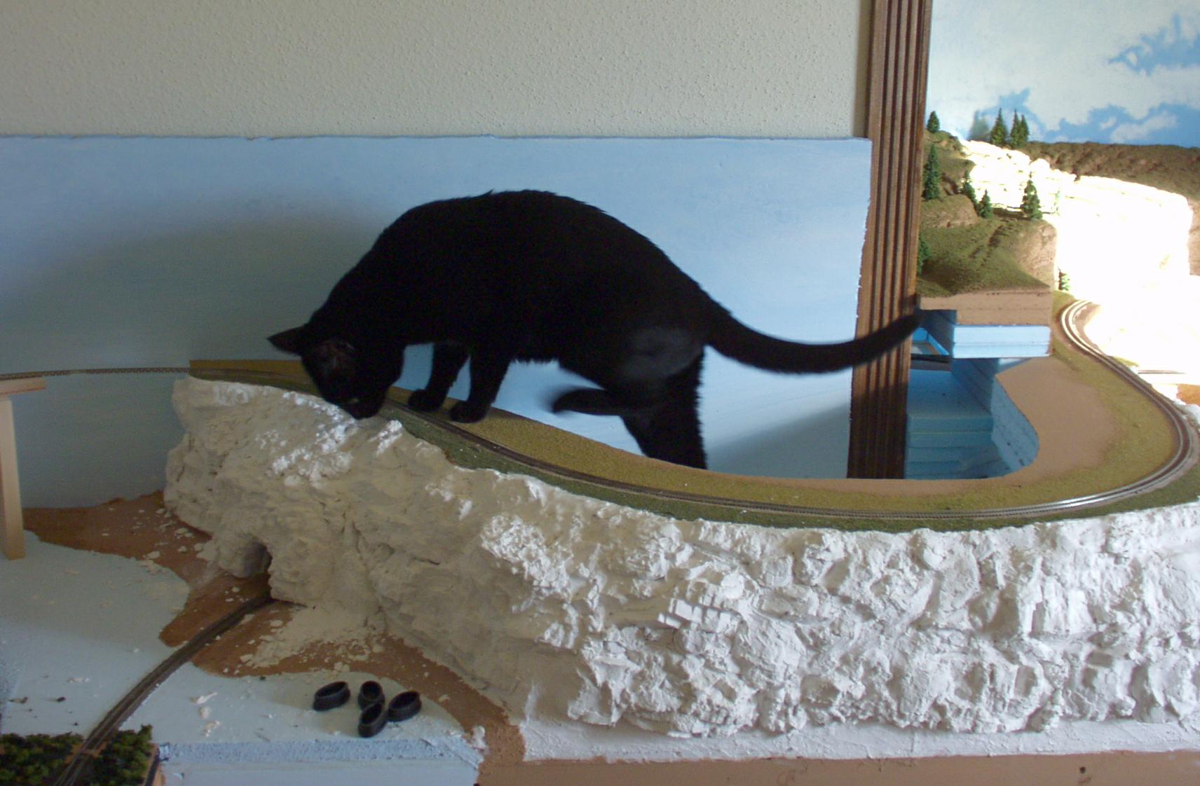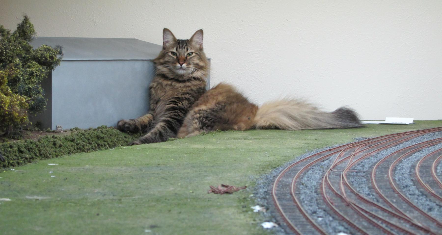 You're not supposed to have favorites among your "kids", but our dearly-departed Tobey was my all-time favorite. Here he is "sniffing glue", as teenagers do these days, on top of my previous layout.