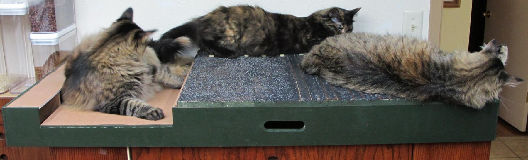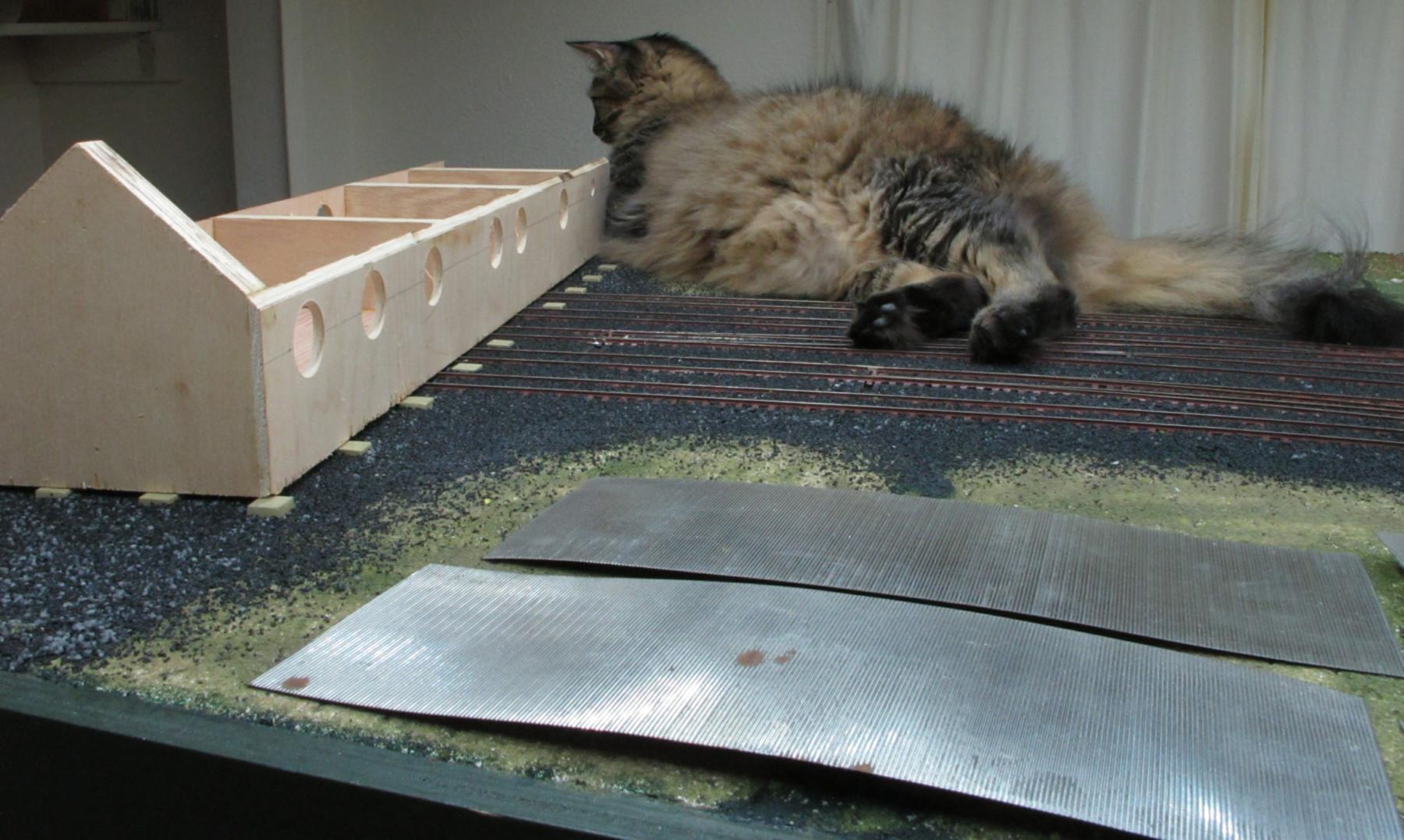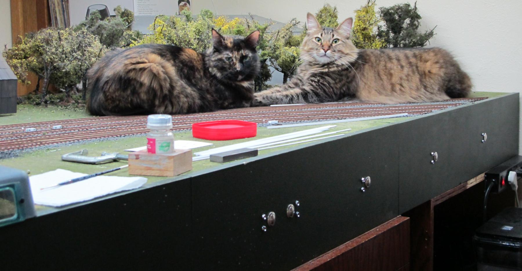 Spanky (left), his sister Buttons, and older sister Tabitha (right) stress-testing my Gatorfoam module for my current layout (about 30 pounds of cats)