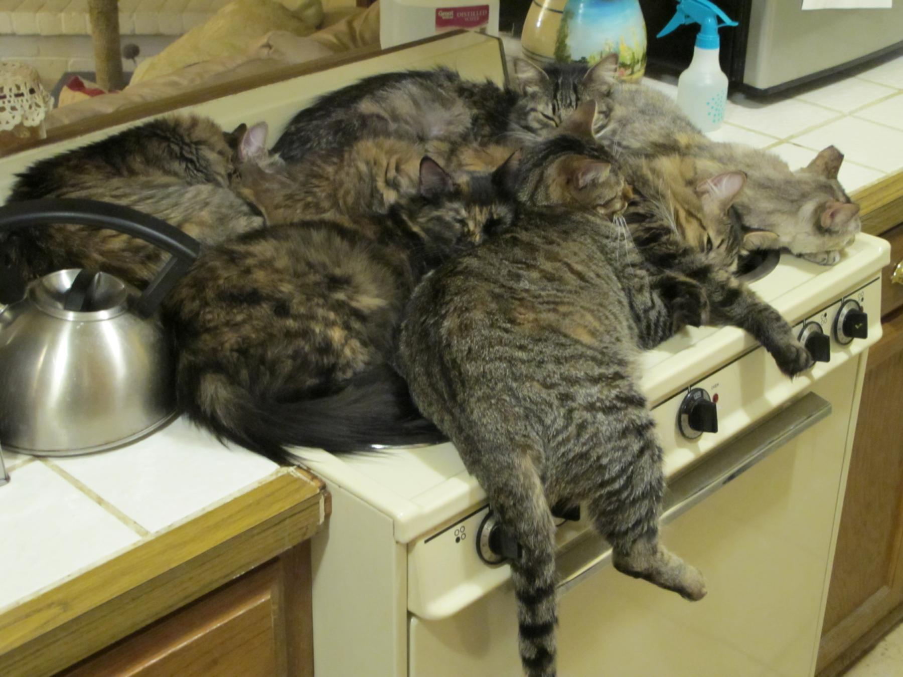 When you have six cats, the house is cold, and the stovetop is still a little warm from something that was baked in the oven a while ago.