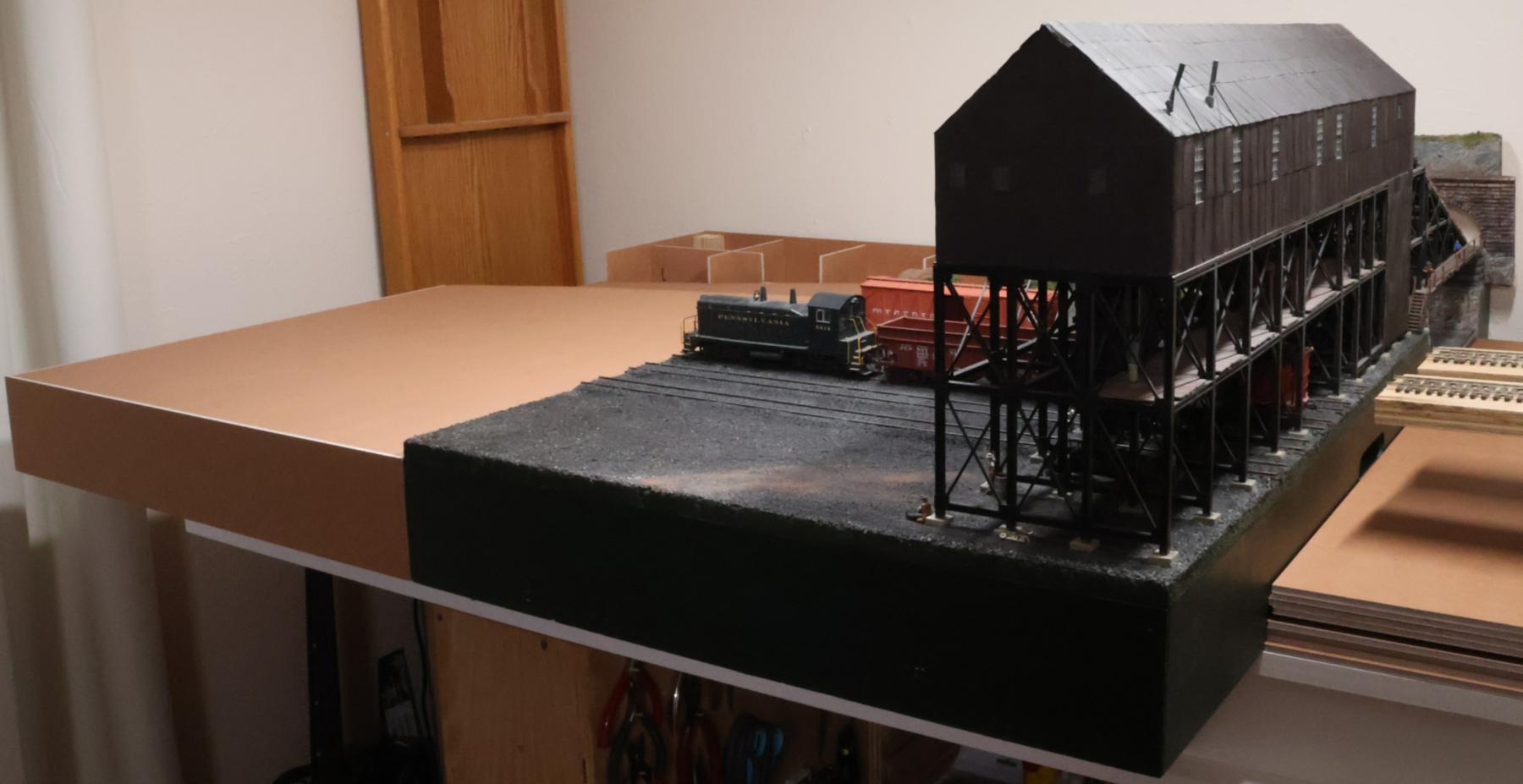 My layout is modular/sectional in nature. The first module is finished, and the second one is under construction. The third module is planned for 2026. Click the "Layout" button to read the full story, with lots of photos. These modules will form a scene centered around the Hazel coal mine in Canonsburg, PA. Its tipple is featured on the first module, shown here. What you see in the photo took me just shy of three years to build (mostly due to lack of available hobby time). Everything was built from scratch, to scale, and with no compression. The entire structure, as shown, is made out of 1,800 individual pieces. And, yes, I counted each one of 'em as I added them to the building!